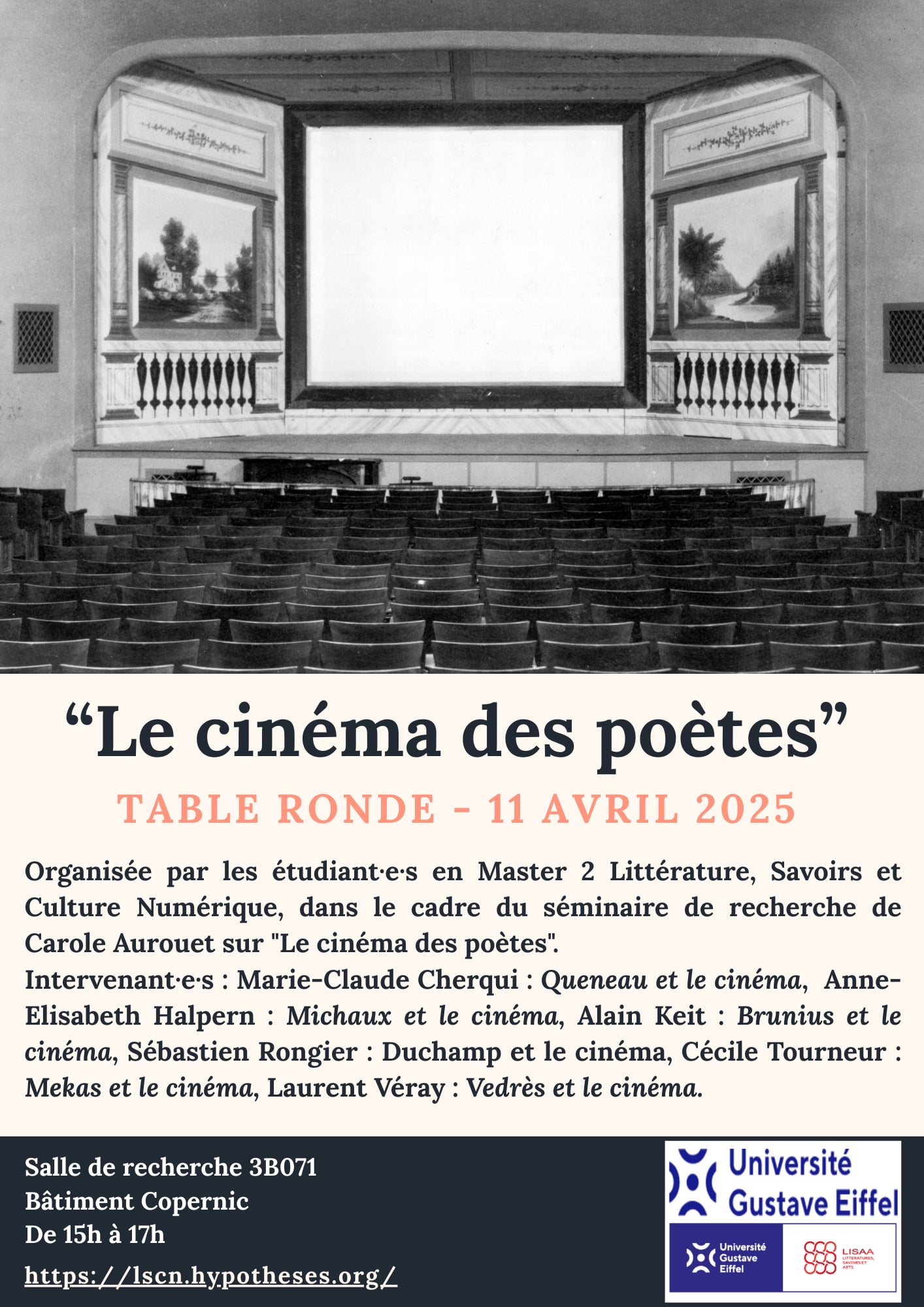 La table ronde, intitulée "Le cinéma des poètes", est organisée dans le cadre du séminaire de recherche dirigé par Carole Aurouet (LISAA, université Gustave Eiffel) et accueillera six intervenants qui aborderont ce sujet en fonction des essais rédigés dans la collection du même nom.